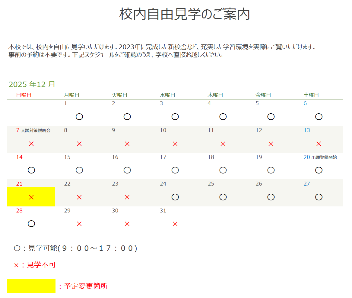 12月の校内自由見学についてのご案内です。