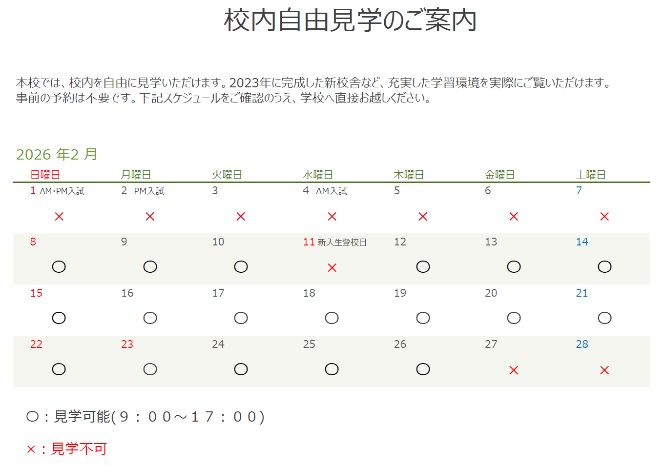 2月の校内自由見学についてのご案内です。