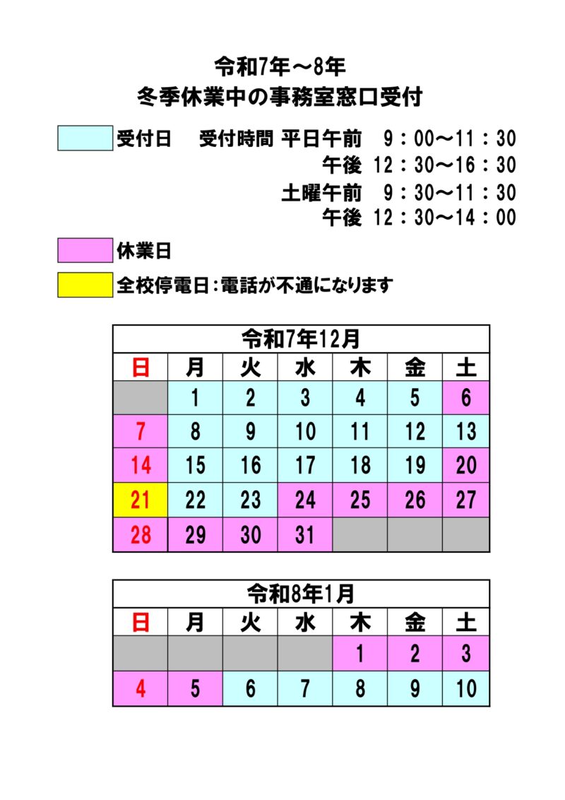 12月、1月の事務室窓口受付は以下のカレンダーのとおりとなります。