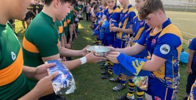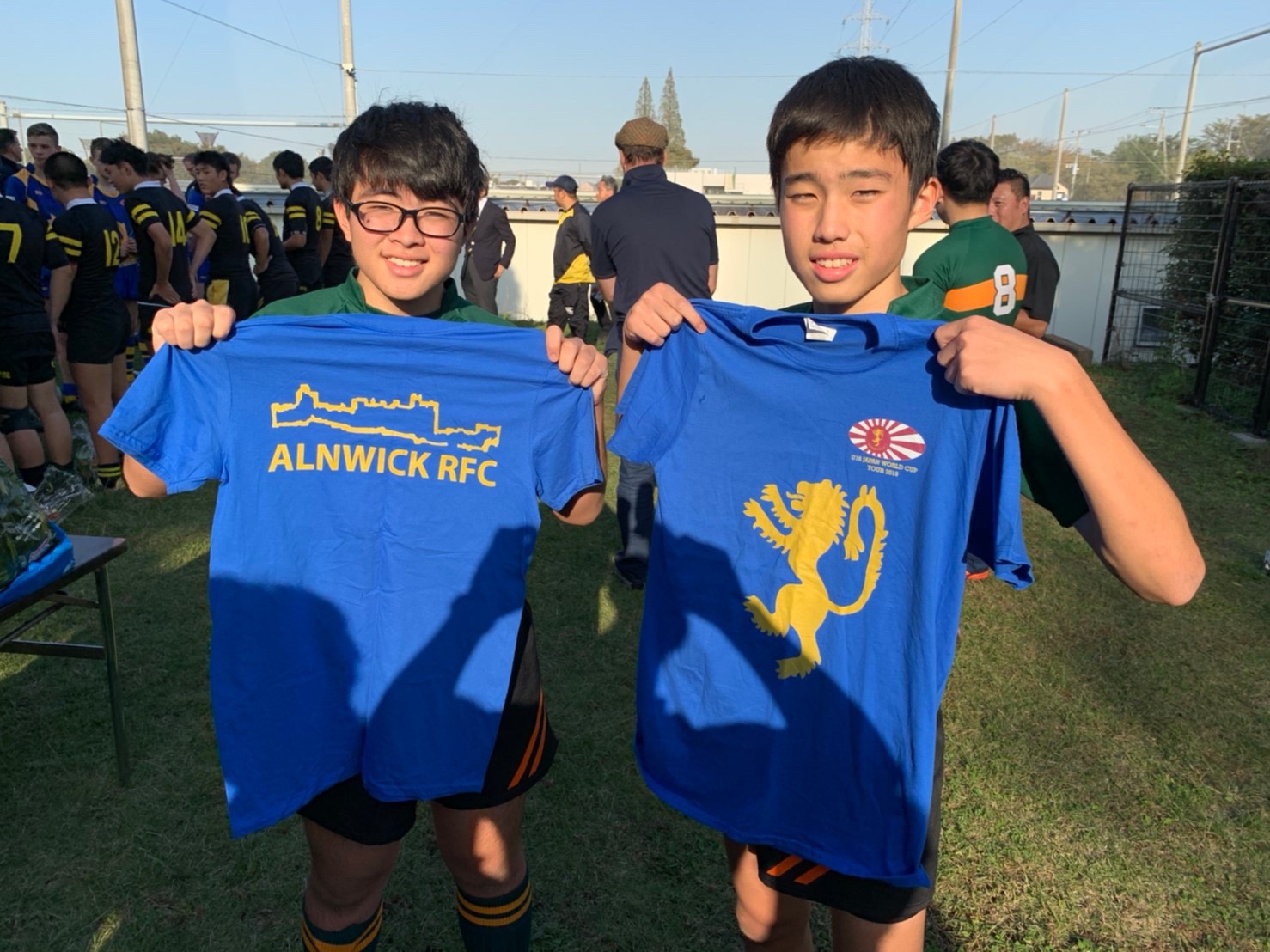 ラグビー部は、本日英国alnwickU16チームと親善試合を行いました。 青山学院高等部との三つ巴で試合を行い、勝つことができました。 試合後は、ファンクションにて記念品贈呈やエール交換をしました。 本校からは農大手拭いをプレゼントし、alnwickからはTシャツをもらいました。